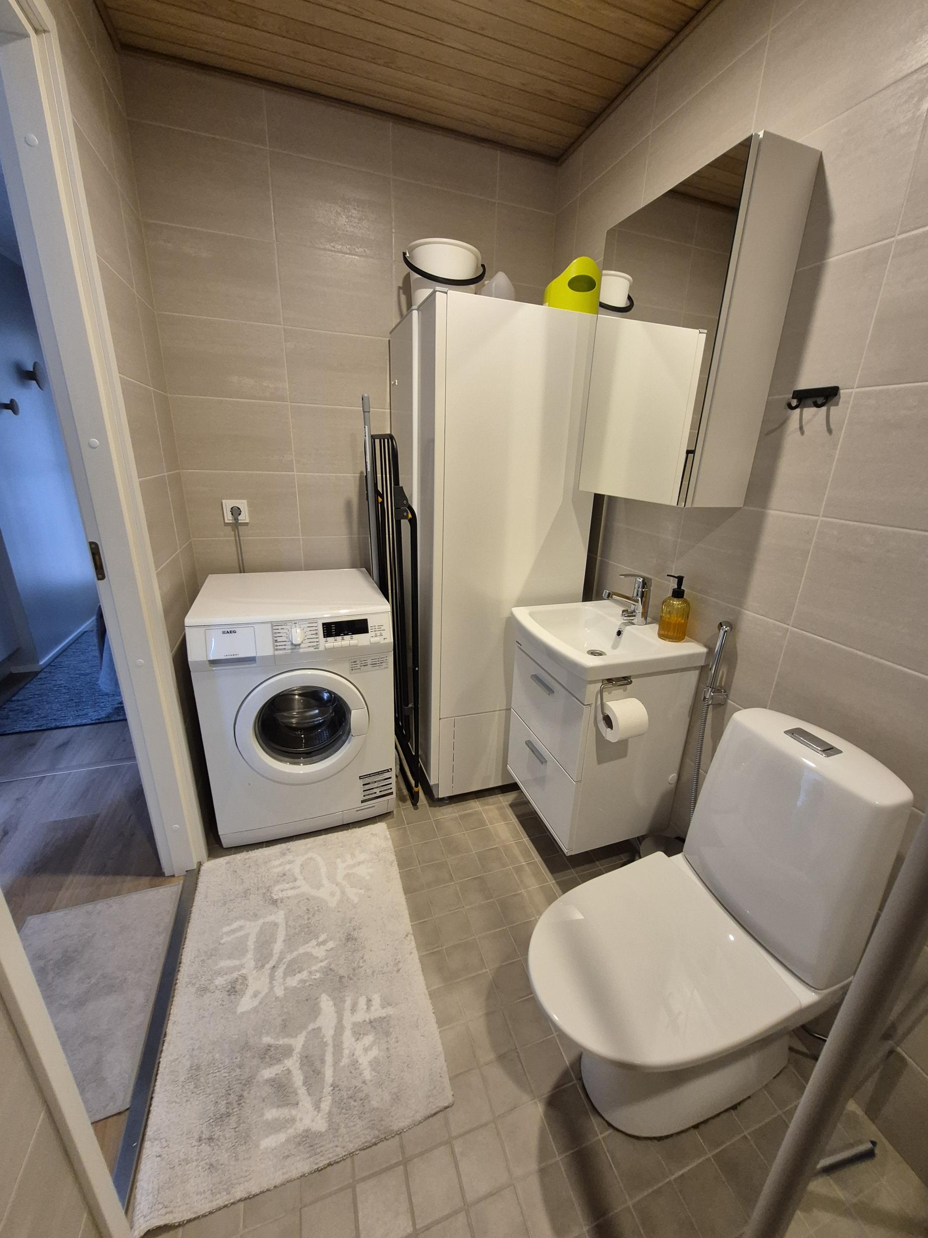 Keittiö: astiastot, astianpesukone, jääkaappipakastin, kahvinkeitin, leivänpaahdin, mikro, sähkövatkain, vedenkeitin, kattilat ja paistinpannut